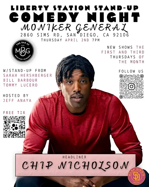 If you need a reason to get out on a Thursday, this is a strong one. Liberty Station Comedy Night is back at Moniker General with a stacked lineup and a headliner who knows how to light up a room. Chip Nicholson is San Diego-raised, now LA-based, and brings the kind of set that feels polished, energetic, and dangerous in all the right ways. He’s performed at the Hollywood Improv and The Comedy Store, appeared in the 2026 Just For Laughs New Faces Auditions, and built real momentum on the festival circuit with credits including Boulder, Bergamot, and Vail, plus a win at the 2023 Alaska B4 You Die Comedy Festival.